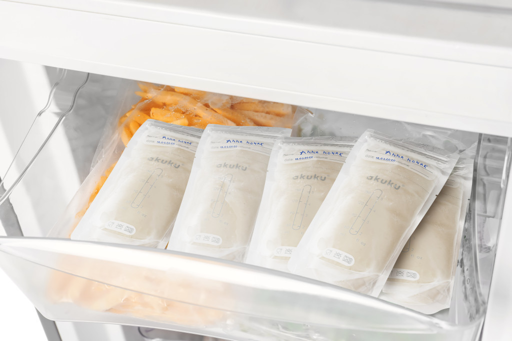 öntse a frissen lefejt anyatejet a tasakba; kérjük, ne lépje túl a 150 ml-es űrtartalmat, hogy maradjon elegendő hely a tasak tetején a tágulás számára.
