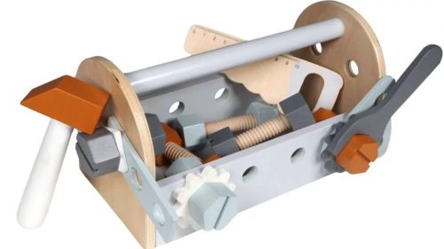 A játék tartalma:• 6 db csavar• 6 db anyacsavar• 2 db fogaskerék• 2 db villáskulcs• 1 db fűrész• 1 db csavarhúzó és kalapácsMéret: 24x12x13 cm