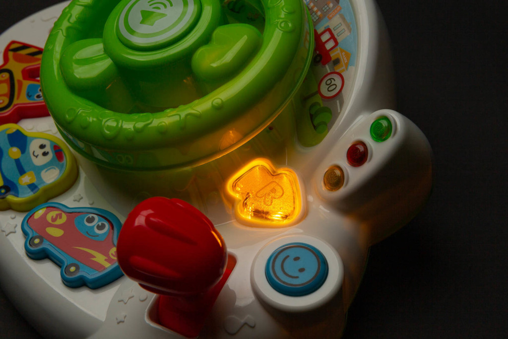 A játék tartalmazza:• Kormánykerék – benne duda hanggal, amelyet a gyerek megnyomhat. • Tükör – vizuális felfedezéshez. • Irányjelzők – hanggal és fényekkel. • Váltókar – a jármű gyorsulását imitáló hanggal. • Gombok járműképekkel – amelyek különféle járműhangokat és vidám dallamokat játszanak le. • További gombok – dallamokkal és baba nevetéssel.