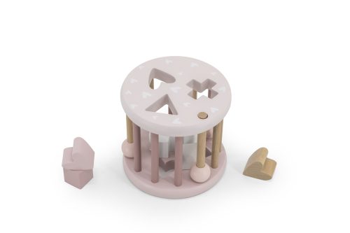 A Label-Label újragondolta letisztult formaválogatóját és megalkotta ebben a gyönyörű pasztell rózsaszín és fehér színben formaválogató kerekét. A kerék 6 különböző formájú fa alakzatot rejt, mint például a háromszög, a téglalap, a kör, és a szív. A kicsik feladata az, hogy a különböző fa formákat a hozzáillő lyukakba, illessze. A pálcák végén egy golyó van és ezen pálcák segítségével szedhetők ki a formák a kerékből. A gyerekeknek órákon át tartó szórakoztató játék lehetősége biztosít. Mert lehet gurítani és még csörgőnek is jó!