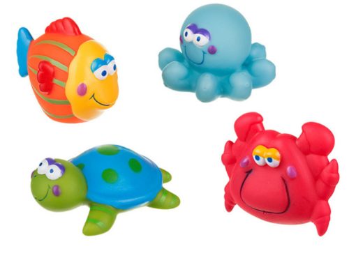 4 db-os színes fürdőjáték figurák. A színek és a formák felkeltik a gyermek figyelmét és megismerkedhetnek néhány állattal, amik a vízben élnek.
